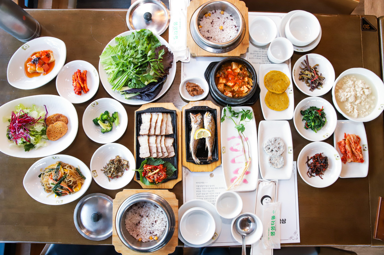 다양한 반찬과 메인 요리가 한 상 가득! 솥밥과 누룽지, 된장찌개, 각종 나물과 잡채, 보쌈, 굴비 등 푸짐한 구성이 특징입니다. 넓은 매장과 쾌적한 분위기로 단체 모임도 추천!