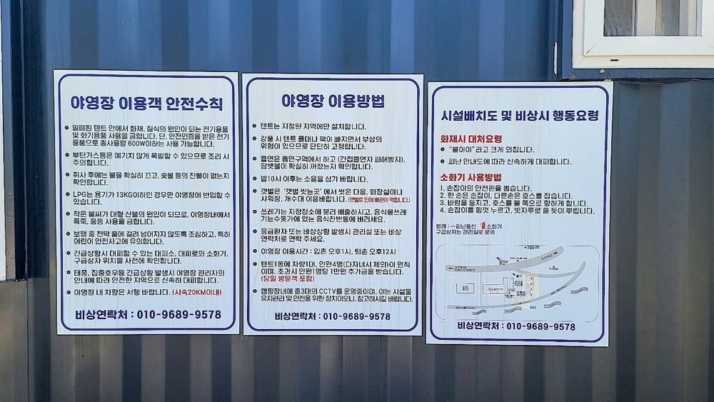 - 주의사항: 1~3번 사이트 차량 진입 금지, 22:00 매너타임, 화기 사용 금지. 🚭