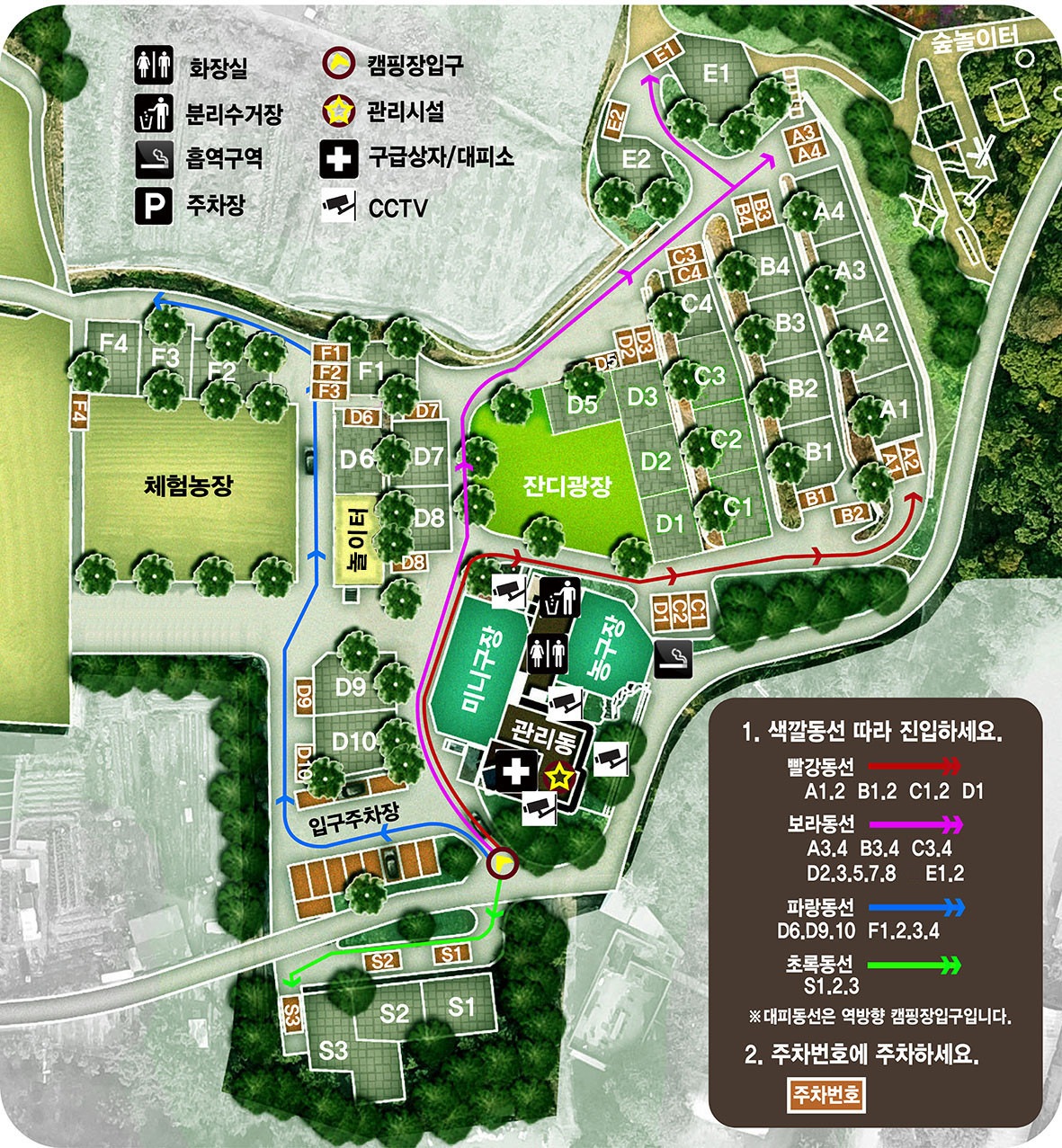 3. 사이트별 매력: 캠핑장은 A~F 구역으로 나뉘어 있으며, 특히 D구역은 잔디광장과 가까워 아이들과 함께하기 좋아요. 각 사이트는 파쇄석으로 깔려 있어 안정적인 피칭이 가능하며, 나무 사이로 그늘이 있어 여름에도 시원하게 캠핑을 즐길 수 있어요. 🌲