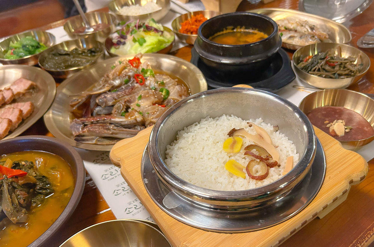 *초등학교 1학년 이상부터 솥밥정식을 주문해야 하며, 양념게장과 수육은 추가 주문 가능. 반찬은 셀프바에서 무한 리필!