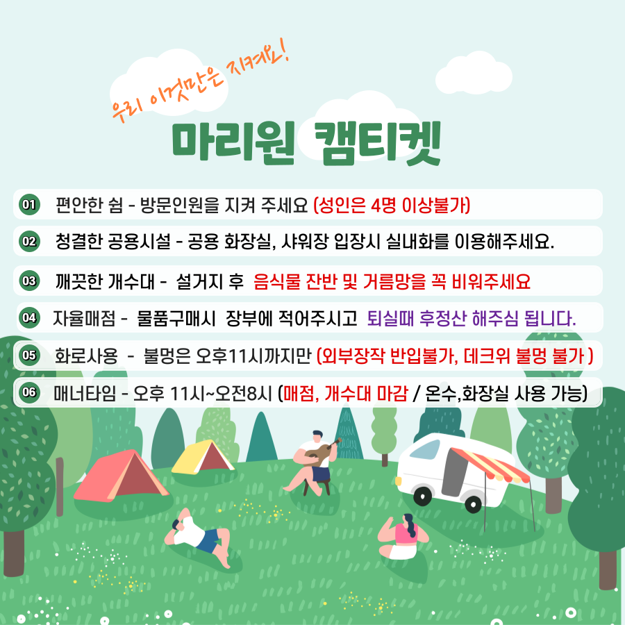 마리원 캠핑 방문을 계획 중이라면, 아래 표에 정리된 핵심 정보를 확인하고 완벽한 캠핑을 준비하세요! 😊