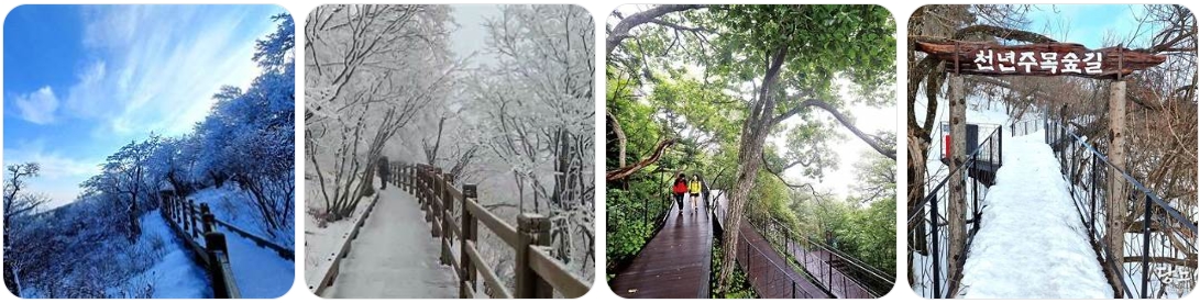 - 발왕산 천년주목숲길은 사계절 내내 색다른 매력을 뽐냅니다. 봄에는 연둣빛 새싹과 꽃들이 만발하여 생명의 기운을 느낄 수 있으며, 여름에는 시원한 녹음과 맑은 공기로 더위를 피할 수 있는 안식처가 됩니다. 가을에는 숲 전체가 붉고 노란 단풍으로 물들어 한 폭의 그림 같은 풍경을 연출하며, 겨울에는 설경과 눈꽃, 그리고 상고대가 어우러져 마치 동화 속에 있는 듯한 착각을 불러일으킵니다.