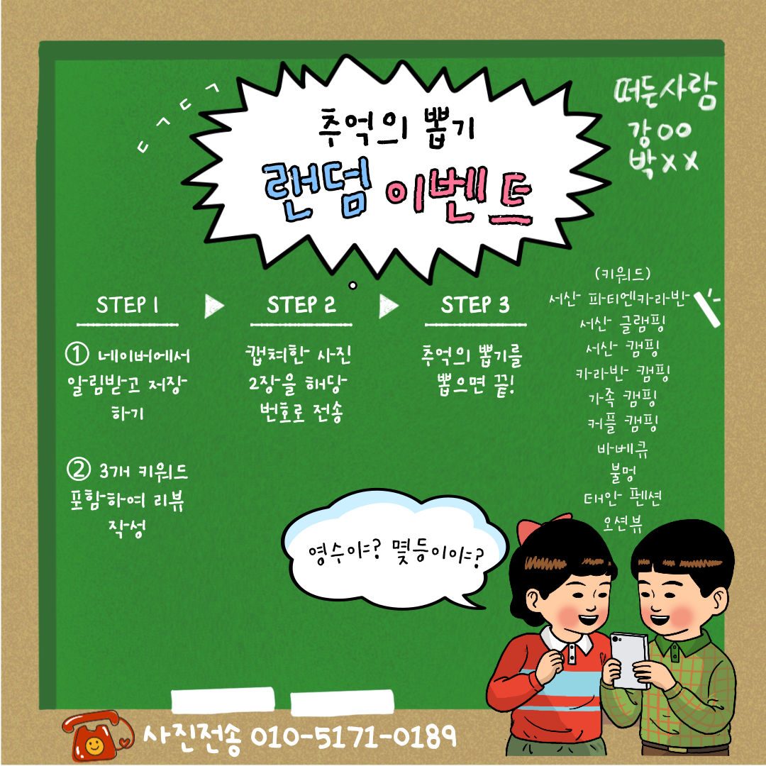 | 이용 요금 | 파티카라반: 79,000~259,000원 (최대 4인) / 신축파티카라반: 89,000~259,000원 (최대 5인) / 패밀리카라반: 79,000~229,000원 (최대 5인) 💸 |