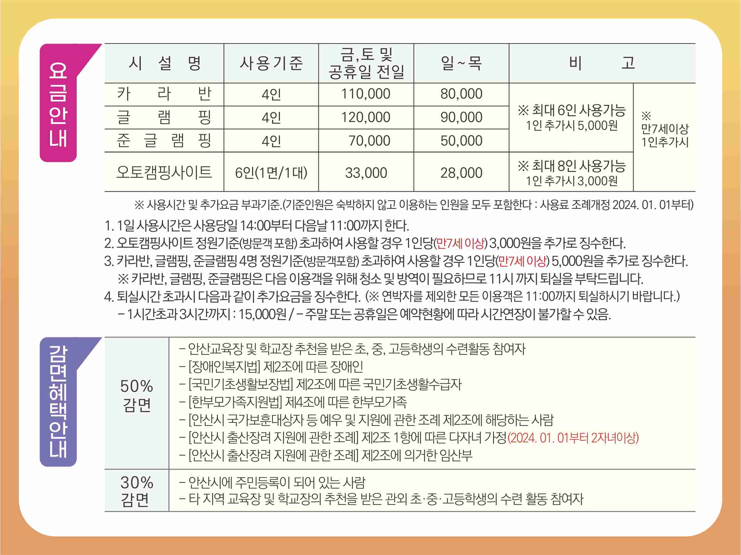 | 이용요금 | ∙오토캠핑: 평일 28,000원, 주말 33,000원 ∙ 글램핑: 평일 90,000원, 주말 120,000원 ∙ 카라반: 평일 80,000원, 주말 110,000원 |