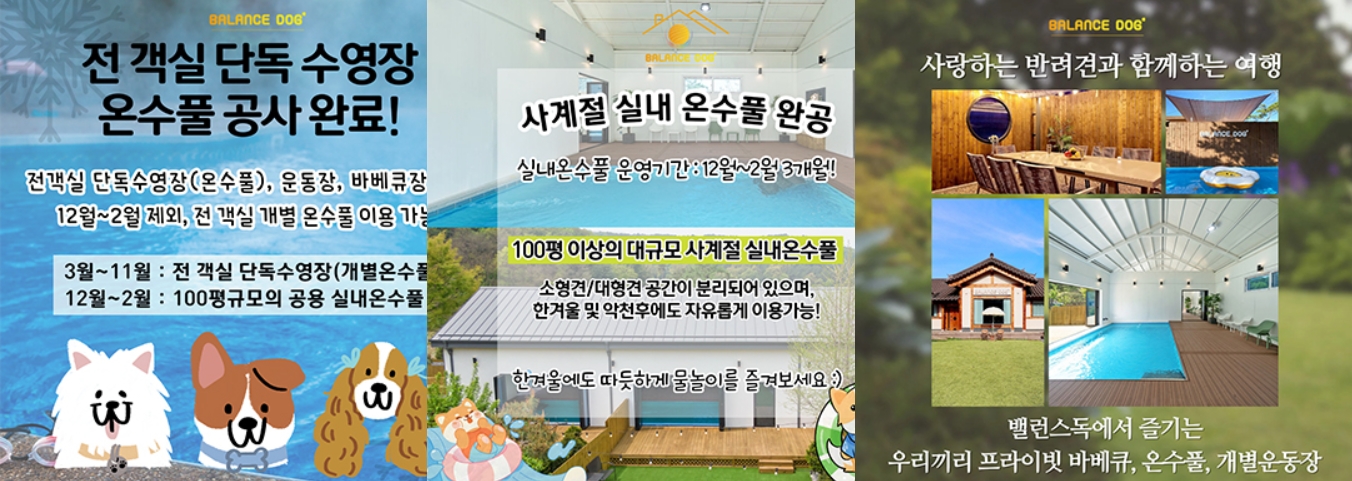 - 특징: 하루 한 팀만을 위한 독채 풀빌라 펜션으로, 천연 잔디와 인조 잔디 마당, 대형 수영장 등 반려견을 위한 다양한 시설이 완비되어 있습니다. 감성적인 인테리어와 4계절 이용 가능한 바베큐장이 있으며, 대형견도 동반 가능합니다.