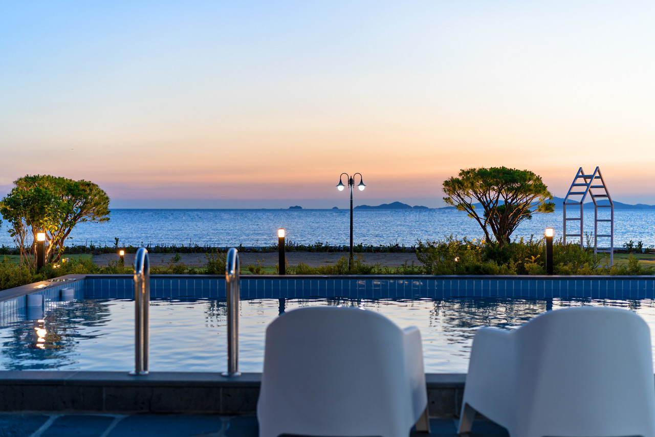 - 포토존: 수영장 옆 그네 의자와 갯벌 앞에서 인생 샷 찍기. 📸