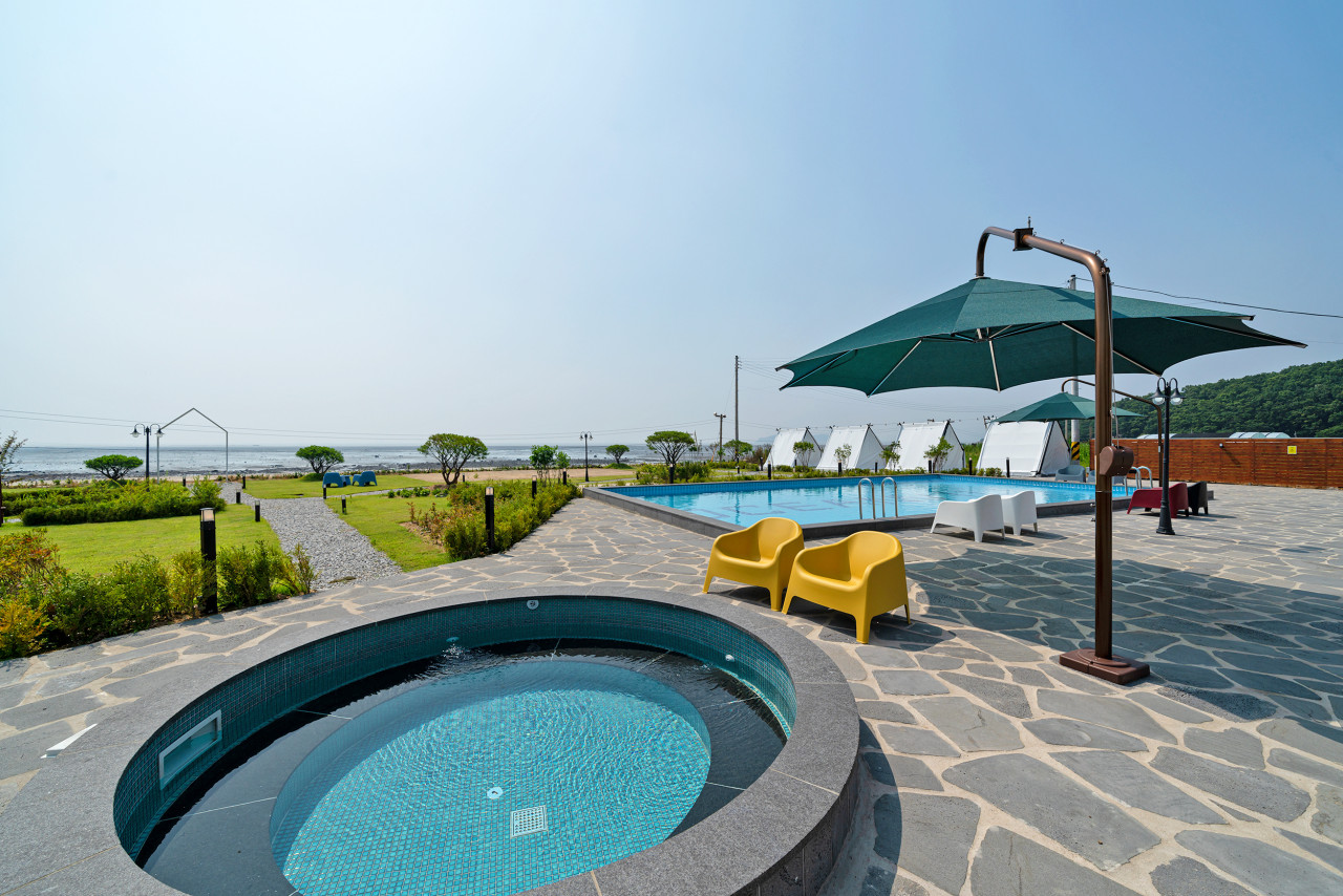 오션빌 글램핑은 바다와 10초 거리의 오션뷰로 캠퍼들의 심장을 뛰게 합니다. 7개의 돔형 객실은 2인 기준(최대 4인)으로, 킹사이즈 침대, 스마트 TV, 넷플릭스, 온돌 바닥, 그리고 넓은 개별 화장실을 갖췄어요. 주방에는 인덕션, 전자레인지, 밥솥, 스테인리스 식기까지 완비되어 호텔급 편의를 자랑합니다. 여름에는 대형 수영장과 온수풀, 600평 잔디광장에서 아이들과 뛰놀 수 있고, 개별 바비큐장은 프라이빗한 식사를 보장하죠. 갯벌 체험과 노을 산책은 덤입니다! 단, 반려동물은 입실 불가니 참고하세요.
