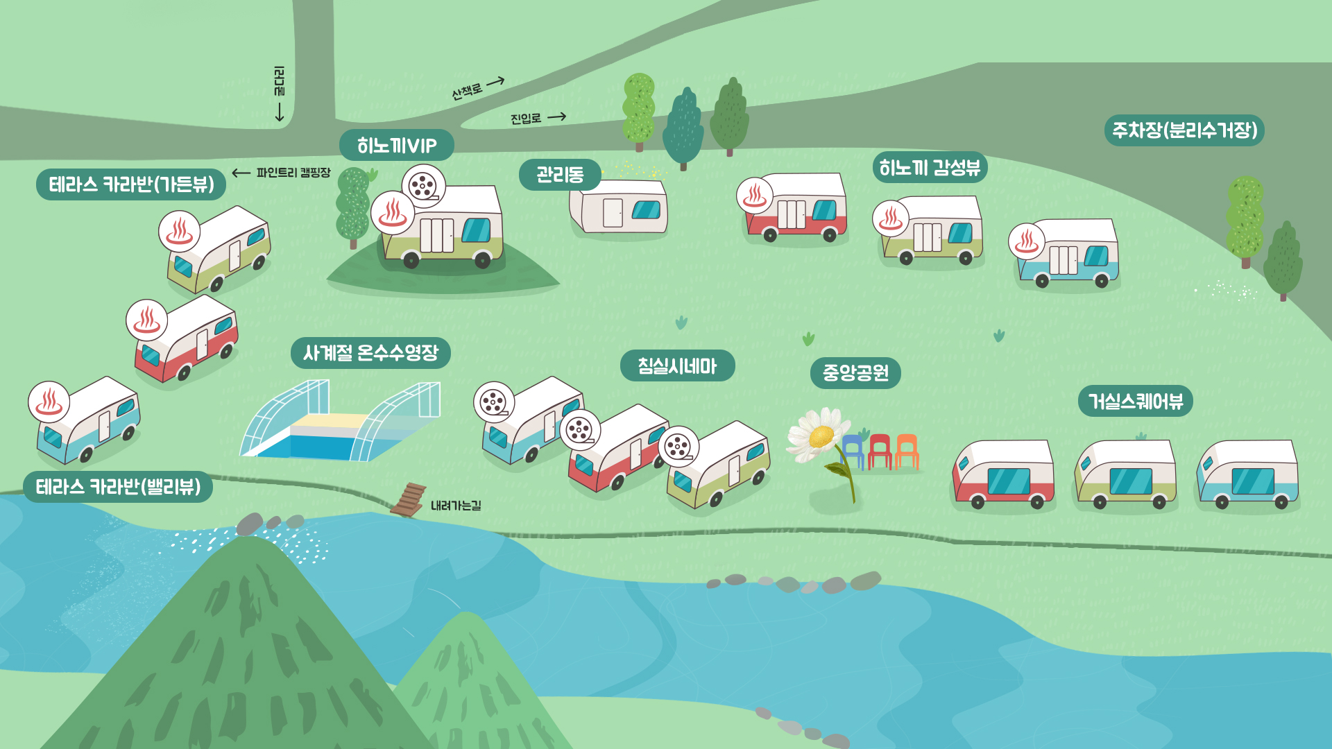 - 뷰 좋은 장소 추천: **VIP 테라스 카라반(밸리뷰)**는 계곡 뷰와 히노끼탕이 있어 명당이에요.